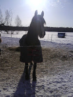 .. men som tur var hade jag gud med mig (tur att jag han bli halv religös)... Var ute och körde MONSTRET!!.. (numera Monstret, inte Trollet).. Hon visade sig från sin riktiga sida idag.. Innan har hon var världens finaste att köra, jogga på så fint så... Men nu kom demonen fram i henne!(förstår varför hon har fått sitt ryckte!!!) Först skenade hon på järnvägen, rakt mot östa vägen... Fick ner henne i skritt igen, å kunde köra över lugnt å stilla över vägen. Sedan satte hon igång igen.. Greppa bettet och drog iväg i världens sken! Rakt mot 56:an.. Tanken var att jag skulle köra in i skogen, men med en kilometer tid på 1,10 så gick det inte att svänga!! Vi forsatte i full fräs! Tankarna på hur jag skulle bli mosad mot en lastbil blev mer och mer uppenbar.. Men så, ca 50 meter från 56:an stanna hon...Puha! Sen var det bara att fösöka vända riktningen från 56:an ifall att hon skulle sätta fart igen... Väl i en annan riktning började hon skritta lugnt å fint igen.. " Hua, skönt!" han jag tänka, innan IDOTEN högg tag i bettet å lag av i en jävla fart en gång till! "OMG!! Ne nu jävlar går det åt helvetet!!" tänkte jag medans jag försökte värja från alla dessa jävla tallar som ska står i skogen... Denna gång ville hon inte stanna.. Hon sprang bara fortare och fortare! Rakt mot östa vägen igen.. Å denna gång rakt över! Styrde in henne på en gård.. I 100 km/h for vi fram å jag fick syn på en stor lada framför oss.. Jag bytte taktik! "Ne nu jävlar ska du stanna!!!" Vred henne mot ladan och manade på! Hon gjorde världens slidestop in i laduväggen, men stanna iaf!.. Skakis som fan, vände vi hemåt... Hon stressad och jag funderande på om vi kommer komma hem över huvuvd taget... Hon var faktiskt lugn i säkert 300 meter.. Tills vi kom ut på järnvägen igen.. Då drog hon igen... Men denna gång hade jag 3 km raksträcka så nu fick kossan springa!!! Drev henne ist för att bromsa.. efter 2 km ville hon stanna.. men det var bra för henne att sringa, det var ju de hon ville!!! med 500 meter kvar testa jag att bromsa å hon stanna på en gång! (Hua.. tur annars hade vi hamnat rakt in i negerbyn!!).. med ett stadigt tag i tömmarna lyckades jag få henne att vända kosan hemåt.. Efter ett par försök till nya skenturer kom vi iaf hem igen... Nu ska det bli ridnig på henne ist! Känns som att det är lite farligt att göra fler sånna här vansinnes turer!!!